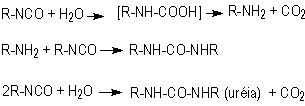 The five main reactions making up PU's technology are those of isocyanate with: (1) polyols, to form polyurethanes; (2) amines, to yield polyurea; (3) water, to form polyurea and carbon dioxide which is the main blowing agent in PU foams; (4) urethane and (5) urea groups resulting in the formation of allophanate and biuret cross-linking, respectively (Figure 1.6).